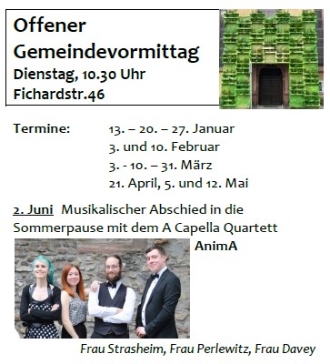 Es haben sich aus unserer Gemeinde Ehrenamtliche gefunden, die gerne zu einem „Offenen Gemeindevormittag“ dienstags von 10.30 Uhr bis 12.00 Uhr einladen.